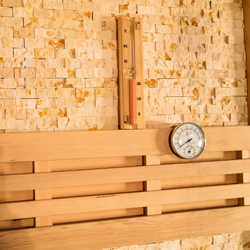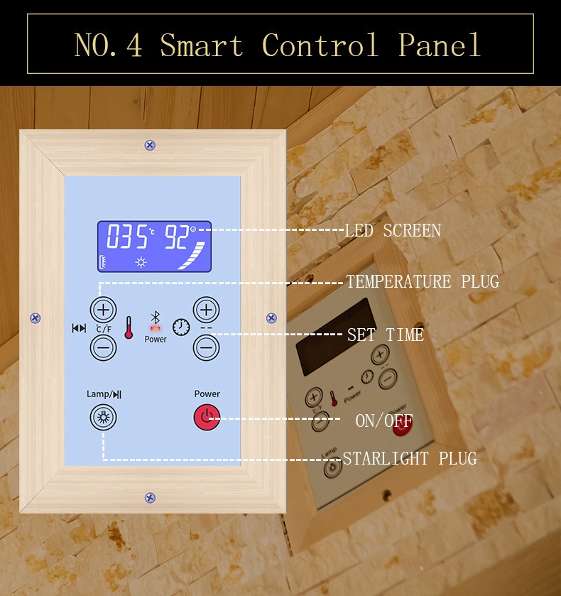 - Sensor de temperatura: Integrado en la pared lateral de la sauna para capturar con precisión los cambios de temperatura en diferentes áreas, asegurando un calentamiento uniforme.