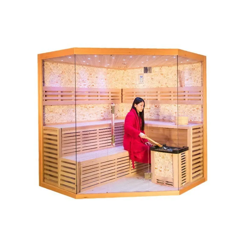 Esta sauna Hemlock con sistema de control inteligente de vidrio de 3 lados integra materiales de primera calidad, diseño transparente, control inteligente y garantías de seguridad, con una artesanía meticulosa desde los componentes principales hasta los accesorios detallados. Ya sea que se utilice como un espacio de relajación privado en casa para experiencias de sauna profesionales en medio de agendas ocupadas, o en entornos comerciales como hoteles, clubes de SPA y centros de fitness para brindar servicios de alta calidad, satisface perfectamente diversas necesidades, creando una experiencia de sauna cómoda, saludable y profesional para usted.