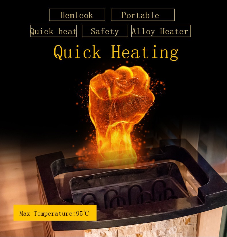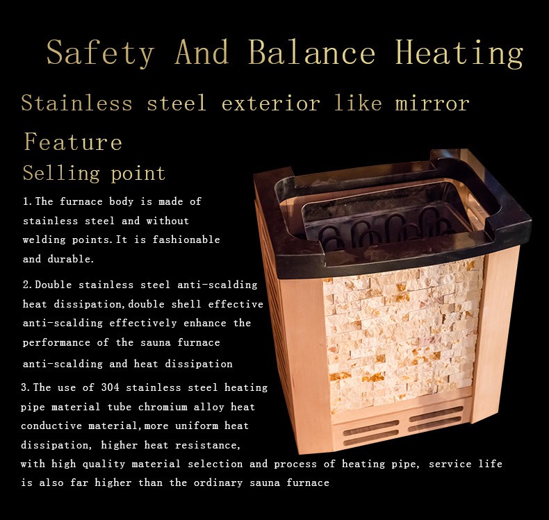 Además, el calentador de sauna está equipado con un dispositivo de protección contra sobrecalentamiento que se apaga automáticamente cuando la temperatura excede el umbral de seguridad, lo que garantiza la eficiencia de la calefacción y la seguridad del usuario.