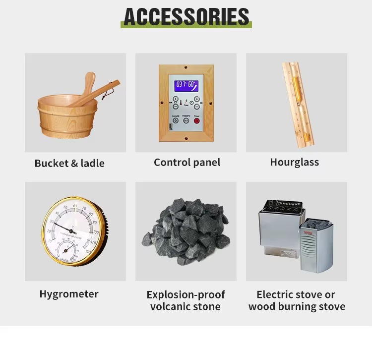 • Viene con una base suspendida de madera para elevar ligeramente la sala de sauna.
