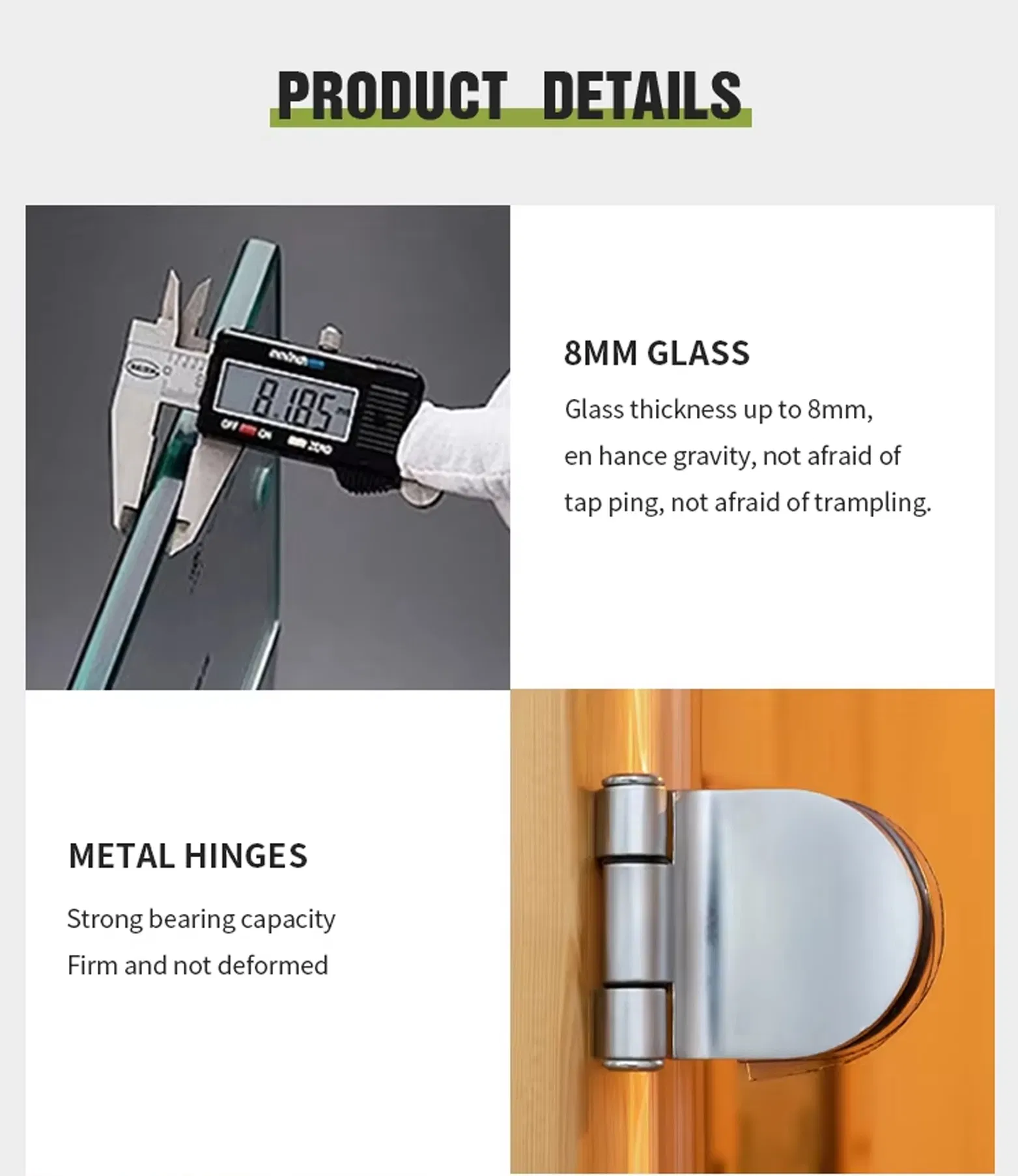 - Bisagras de metal de alta resistencia: bisagras de acero inoxidable con una capacidad de carga de 100 kg, lo que garantiza que su puerta permanezca alineada durante años.
